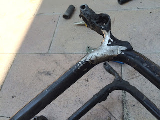 My first defeat was to the big bolt at the center. I couldn't make it move even a bit for days or weeks, no matter what I did. Finally, I took the whole thing to the metal shop that previously did a great job with the front fork bolt. Well yes, just a good hammer blow and it was loose.